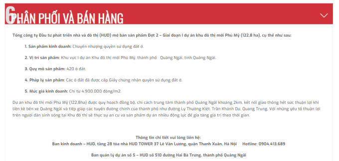 Trên website Hud.com.vn, Tổng công ty Đầu tư phát triển nhà và đô thị (HUD) cho biết doanh nghiệp đang mở bán sản phẩm đợt 2 – Giai đoạn I Dự án khu đô thị mới Phú Mỹ, với quy mô sản phẩm: 420 ô đất. trong đó, mức giá kinh doanh chỉ từ 4.900.000 đồng/m2.