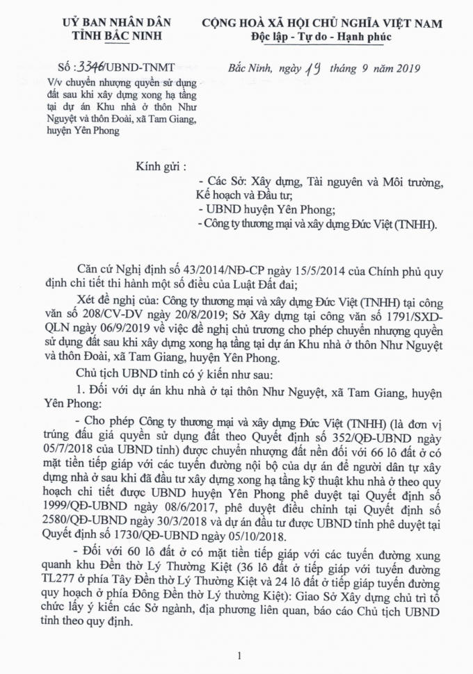 Ngày 19/9/2019, UBND tỉnh Bắc Ninh ban hành văn bản số 3346 về việc Chuyển nhượng quyền sử dụng đất sau khi xây dựng xong hạ tầng tại dự án Khu nhà ở thôn Như Nguyệt và thôn Đoài, xã Tam Giang, huyện Yên Phong.