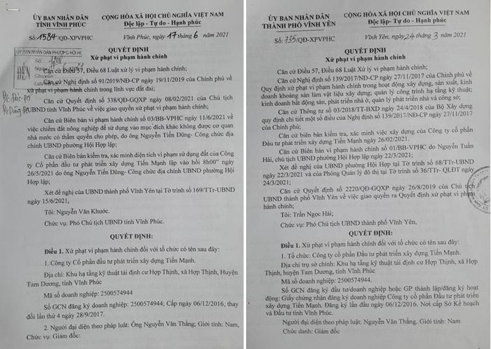 Tiếp đó, ngày 17/6/2021, ông Nguyễn Văn Khước - Phó Chủ tịch UBND tỉnh Vĩnh Phúc ký ban hành Quyết định số 1584/QĐ-UBND quyết định xử phạt Công ty Tiến Mạnh số tiền 420 triệu đồng về hành vi Chiếm đất nông nghiệp là đất trồng lúa tại khu vực đô thị.