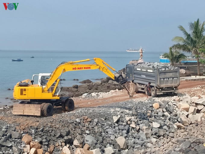 Một lượng lớn đất đá làm mặt bằng được đổ xuống biển trong 2 tuần qua.