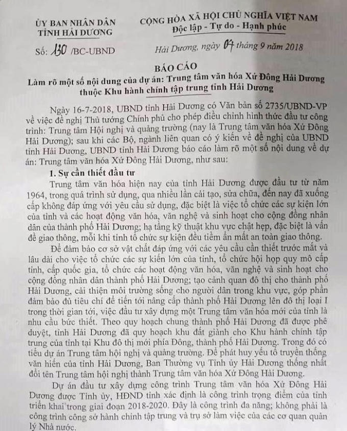 Liên quan đến Dự án đầu tư công trình Trung tâm văn hóa Xứ Đông Hải Dương 648 tỷ đồng, dù đang trình Thủ tướng Chính phủ xem xét phê duyệt nhưng theo báo cáo 130, UBND tỉnh Hải Dương cho biết, hiện đã tổ chức lựa chọn đơn vị tư vấn lập Dự án đầu tư công trình Trung tâm văn hóa Xứ Đông Hải Dương.