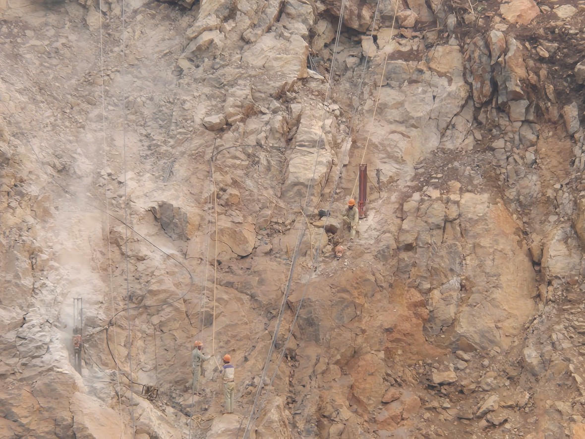 Dù điểm khoan nhồi thuốc nổ cách mặt đất khoảng 50-80m, nhưng qua quan sát, các công nhân chỉ đu, bám dây tời để lên địa điểm khoan mà không được trang bị thiết bị bảo hộ an toàn lao động, không có các thiết bị đai buộc đảm bảo an toàn. Điều này tiềm ẩn nguy cơ có thể xảy ra tai nạn lao động bất cứ lúc nào.