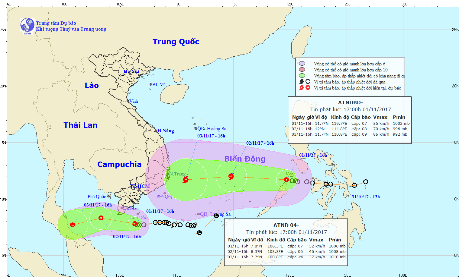 Hồi 16h ngày 01/11, vị trí tâm áp thấp nhiệt đới (ATNĐ) ở vào khoảng 7,8 độ Vĩ Bắc; 106,3 độ Kinh Đông, cách đất liền các tỉnh Bạc Liêu-Cà Mau khoảng 160km về phía Đông Đông Nam. Sức gió mạnh nhất ở vùng gần tâm áp thấp nhiệt đới mạnh cấp 6-7 (40-60km/h), giật cấp 9.