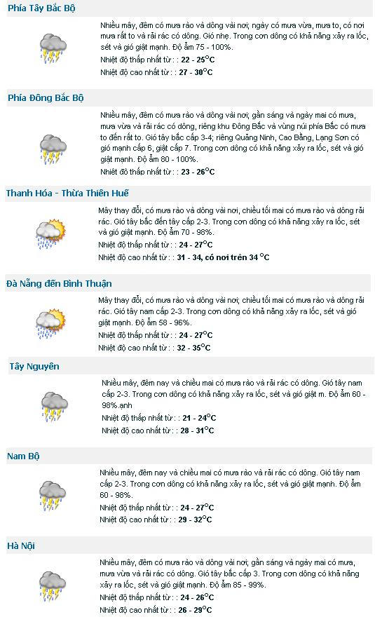 Ngày 17, có mưa, có nơi mưa vừa, mưa to và rải rác có dông, tập trung ở phía nam. Đề phòng khả năng có gió giật mạnh trong cơn dông.