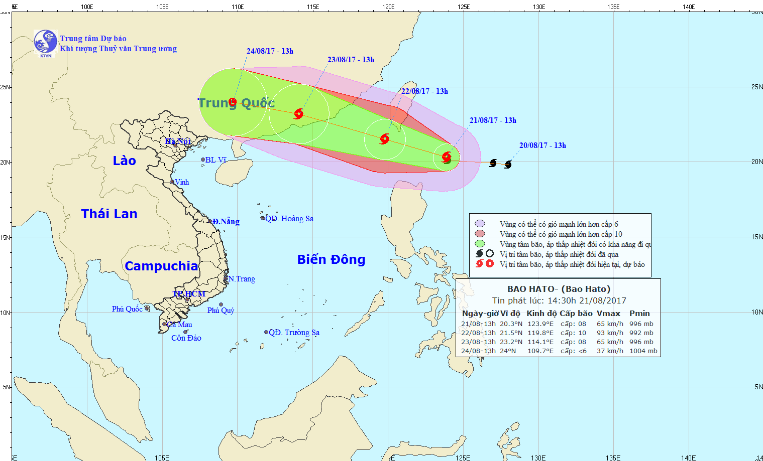 Do ảnh hưởng của hoàn lưu bão Hato, ở phía Đông khu vực Bắc Biển Đông có mưa rào và giông mạnh, từ ngày mai (22/8) gió sẽ mạnh dần lên cấp 6-7, vùng gần tâm bão đi qua mạnh cấp 8-9, giật cấp 11-12. Biển động rất mạnh.