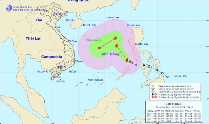 Hồi 19 giờ ngày 26/11, vị trí tâm bão ở vào khoảng 14,6 độ Vĩ Bắc; 117,3 độ Kinh Đông, cách đảo Song Tử Tây (thuộc quần đảo Trường Sa) khoảng 490km về phía Đông Bắc. Sức gió mạnh nhất ở vùng gần tâm bão mạnh cấp 10 (90-100km/giờ), giật cấp 11-12.