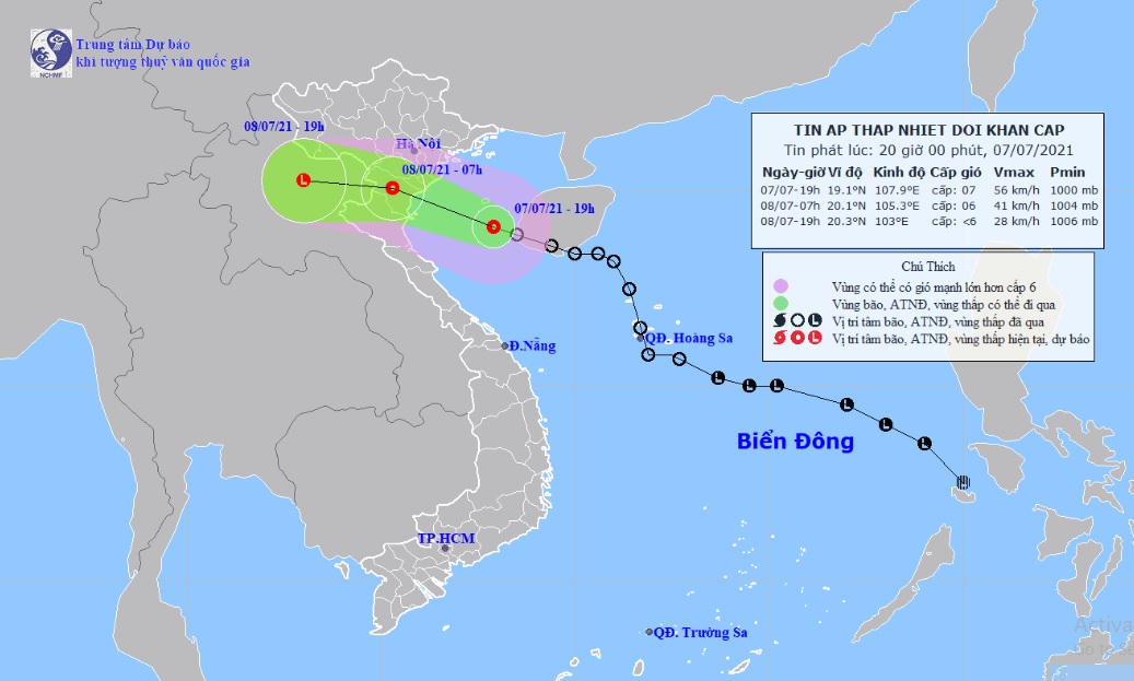 Theo thông tin từ Trung tâm Dự báo Khí tượng Thủy văn Quốc gia tối ngày 7/7 cho biết, áp thấp nhiệt đới đang di chuyển theo hướng Tây Tây Bắc, mỗi giờ đi được khoảng 25 km, ảnh hưởng trực tiếp đến khu vực đồng bằng Bắc Bộ và Bắc Trung Bộ.