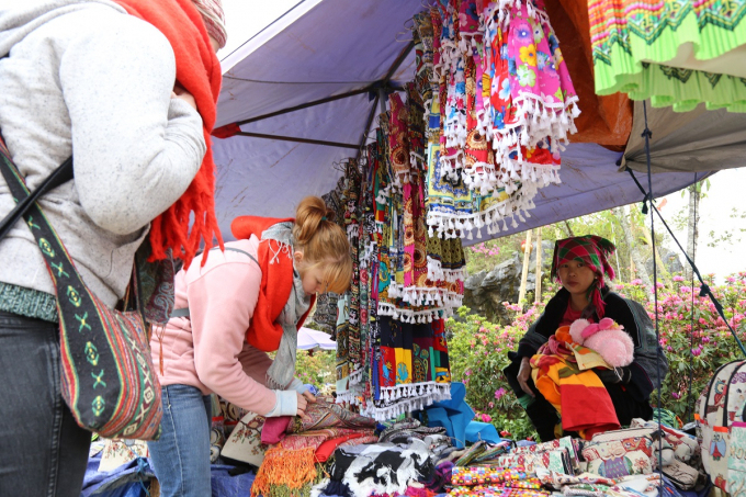 Chợ phiên vùng cao tổ chức ngay trong khuôn viên lễ hội. Người dân bản địa mang đến đây những sản phẩm do chính họ làm ra. Du khách Tây rất phấn khích với hoạt động mang đậm bản sắc dân tộc như vậy. Lựa chọn một tấm khăn nhiều màu sắc, Catherin hào hứng cho biết cô đã mua không dưới 10 món đồ từ “phiên chợ vùng cao” này.