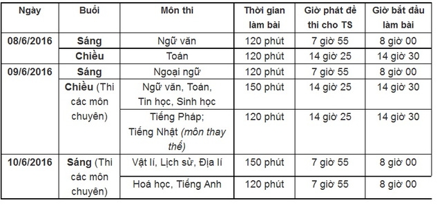 Về lịch thi, thí sinh dự thi vào lớp 10 không chuyên sẽ thi ngày 8/6; buổi sáng thi Ngữ Văn, chiều thi Toán. Thí sinh thi lớp 10 chuyên thi trong 2 ngày: Ngày 8/6 thi môn Ngữ Văn, Toán (cùng với kỳ thi không chuyên); sáng 9/6 thi môn Ngoại ngữ không chuyên; chiều 9/6 và sáng 10/6 thi các môn chuyên theo lịch.