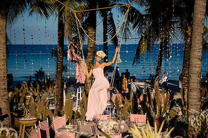 Theo ý tưởng của cô dâu tỷ phú Kaabia Grawal, không gian của tiệc cưới lấy cảm hứng từ biển cả bao la, được trang hoàng thật lộng lẫy, sang trọng nhưng vẫn toát lên vẻ tinh tế, lãng mạn như một câu chuyện cổ tích có thực. Các vật dụng trang trí trong đám cưới đều được sắp đặt mang âm hưởng từ đại dương như những chuỗi vỏ sò, vỏ ốc treo lơ lửng trên cây hay trở thành họa tiết sống động bài trí trong từng chiếc khăn ăn. Ấn tượng nhất là, sân khấu chính của buổi tiệc được bố trí ngay trước bãi biển Bãi Kem êm đềm, thơ mộng khiến không gian của đám cưới thêm phần lãng mạn.
