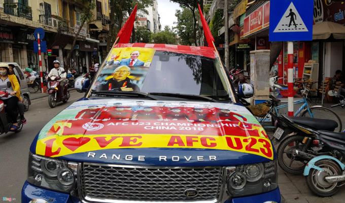 Vào sáng 25/1, một chiếc Range Rover trị giá vài tỷ đồng dán chằng chịt ảnh đội tuyển U23 Việt Nam được chủ nhân đưa đi ra phố mua cúp gắn vào đầu xe gây xôn xao góc phố thủ đô.