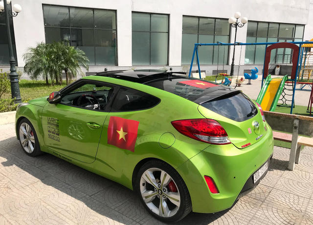 Hyundai Veloster xanh cốm được dán decal quốc kỳ Việt Nam ở cạnh xe.