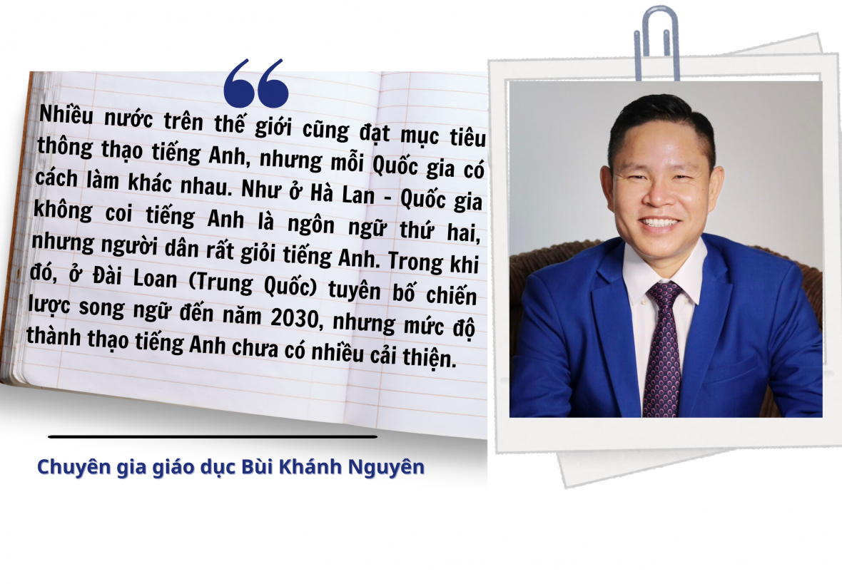 Theo chia sẻ của chuyên gia giáo dục Bùi Khánh Nguyên, nhiều nước trên thế giới cũng đặt mục tiêu thông thạo tiếng Anh, nhưng mỗi Quốc gia có cách làm khác nhau. Như ở Hà Lan - Quốc gia không coi tiếng Anh là ngôn ngữ thứ hai, nhưng người dân rất giỏi tiếng Anh. Trong khi đó, ở Đài Loan (Trung Quốc) tuyên bố chiến lược song ngữ đến năm 2030, nhưng mức độ thành thạo tiếng Anh chưa có nhiều cải thiện.