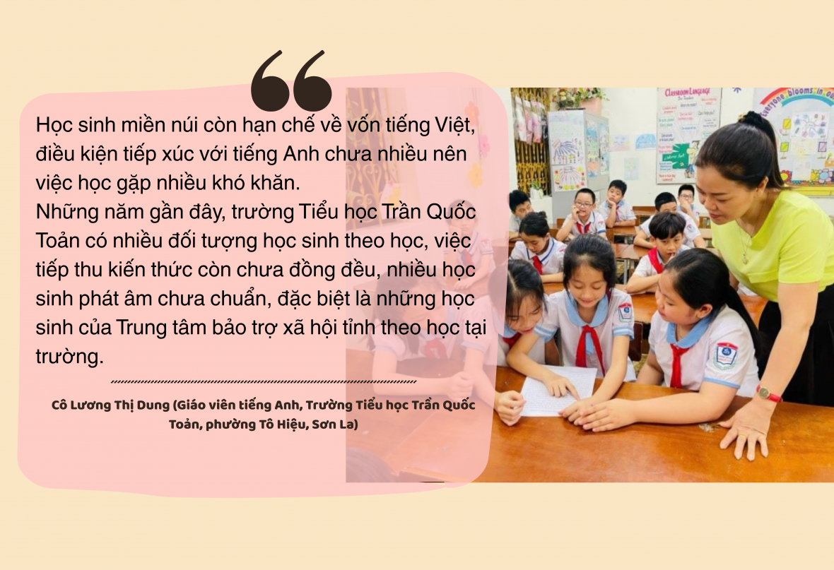 Cô Lương Thị Dung (Giáo viên tiếng Anh, Trường Tiểu học Trần Quốc Toản, phường Tô Hiệu, Sơn La) cho rằng, học sinh miền núi còn hạn chế về vốn tiếng Việt, điều kiện tiếp xúc với tiếng Anh chưa nhiều nên việc học gặp nhiều khó khăn.