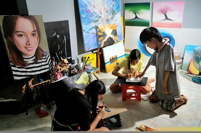‘Tôi nghĩ mình chưa vẽ đẹp. Khi bạn bè cùng phòng dọn dẹp, lật tấm đệm lên, thấy nhiều tranh, họ khen ngợi, mang tranh của tôi treo khắp phòng ngủ. Cứ thế, những bức tranh của tôi bắt đầu được mọi người chú ý, khách đến làng trẻ đều ghé thăm gian phòng trưng bày đầu đời đó’, họa sĩ 28 tuổi bộc bạch.