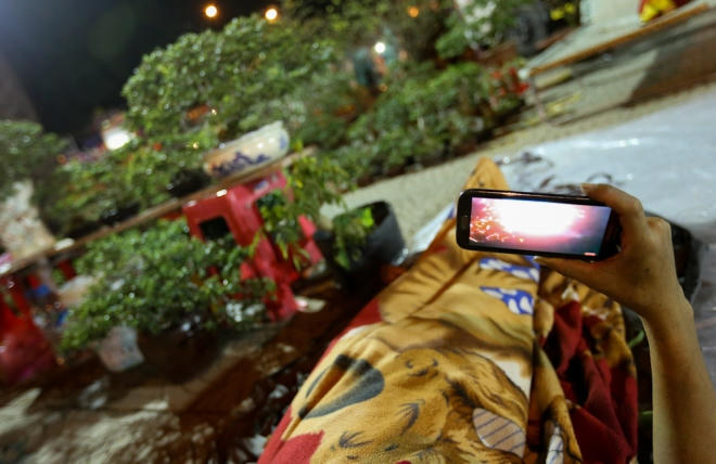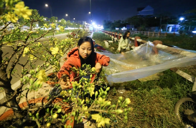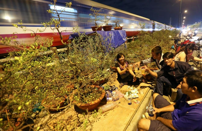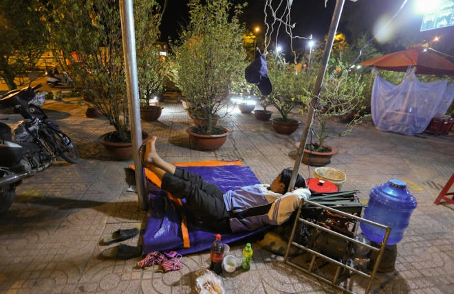 Cận Tết, người bán hoa ở Sài Gòn phải thức trắng đêm, mang theo chăn màn bếp núc để tiện canh giữ những chậu hoa có giá cả trăm triệu đồng bày ngoài lề đường vì sợ mất trộm.