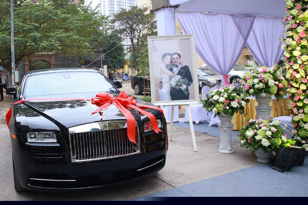 Trước ngày cưới, Thu Ngân được chồng tặng chiếc Rolls-Royce Wraith làm quà. Đây là mẫu Rolls-Royce Wraith đầu tiên về Việt Nam năm 2017 được định giá 30 tỷ đồng. Xe có ngoại và nội thất màu đen "xuyệt tông".