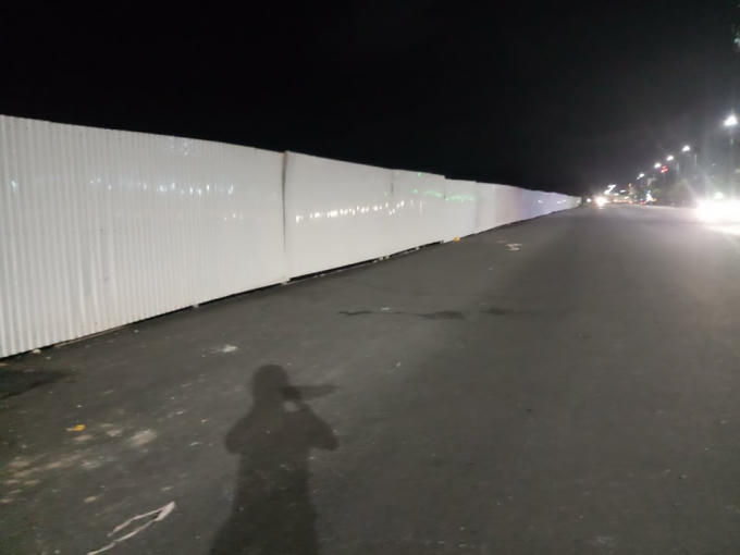 Hàng rào tôn trắng đang được các công nhân dựng lên phân cách làn đường với khu vực thi công.