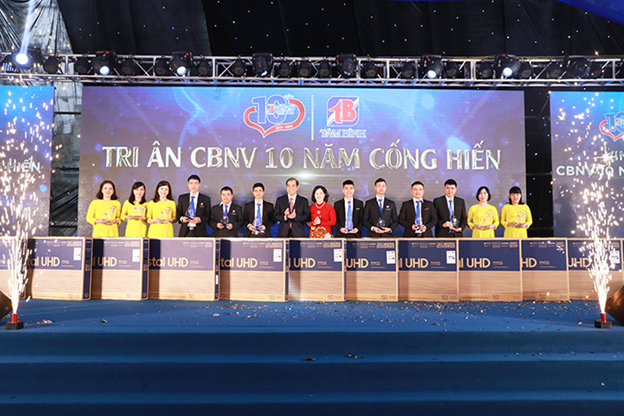 Tổng Giám đốc chụp ảnh cùng các khách mời tại khu vực check-inCon đường lịch sử ghi lại các dấu mốc trên chặng đường 10 năm phát triển của Tâm BìnhTGĐ Lê Thị Bình và Phó TGĐ Nguyễn Thế Hùng trao quà tri ân cho cán bộ, nhân viên thâm niên của Công tyBan Lãnh đạo Công ty nâng ly chúc mừng