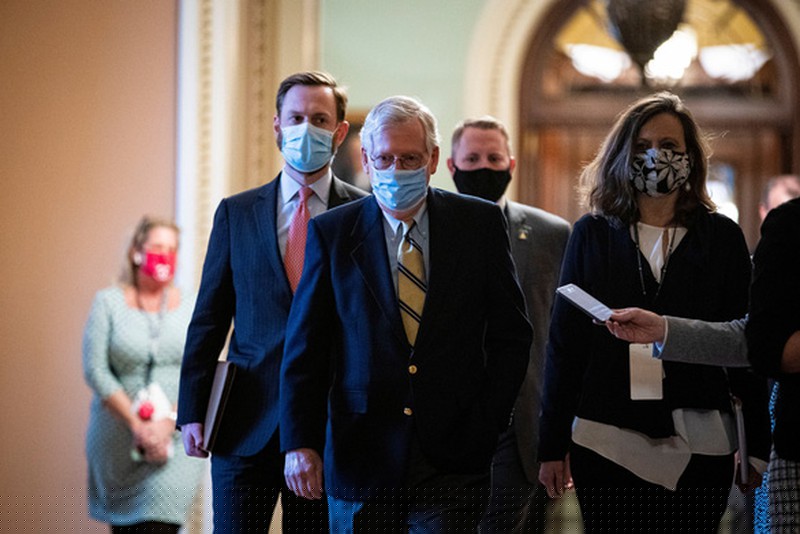 Thượng nghị sĩ Mitch McConnell (giữa) rời khỏi phòng họp thượng viện sau phiên bỏ phiếu. Ảnh: REUTERS.
