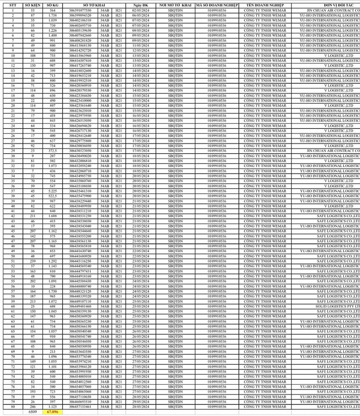 ng là 11.522, tổng trọng lượng là 71.325kg; Công ty TNHH Xuất nhập khẩu thương mại NVH, tổng số tờ khai Hải quan là 308, tổng số kiện hàng là 7177, tổng trọng lượng là 196.537kg ; Công ty TNHH WEMAR tổng số tờ khai Hải quan là 80, tổng số kiện hàng là 6509 , tổng trọng lượng là 67.896kg; Công ty TNHH vận chuyển Quốc tế YU EXPRESS, tổng số tờ khai Hải quan là 237, tổng số kiện hàng là 1105, tổng trọng lượng là 220561kg.