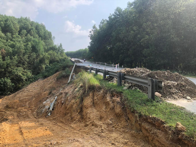 Liên tiếp xảy ra sạt lở tại KM749 + 850, điểm sạt dài 48m, sâu khoảng 18-20m và KM750 + 070, điểm sạt dài 60m, sâu 18-20m.