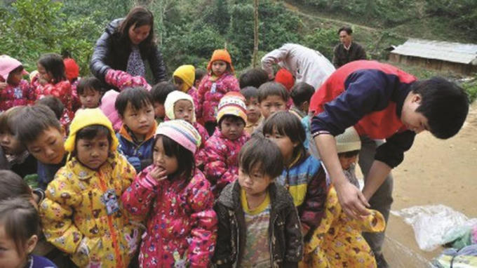 Phóng viên Phạm Diệu cùng Đoàn công tác Báo PLVN tặng áo ấm cho các em nhỏ.