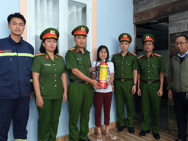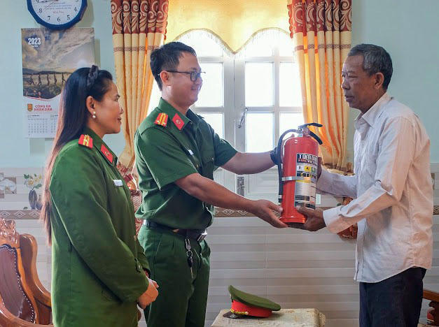 Công an thị trấn Thạnh Mỹ, huyện Đơn Dương tặng bình chữa cháy cho hộ đồng bào dân tộc thiểu số.