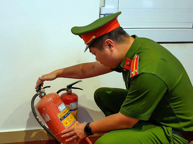 Công an kiểm tra chất lượng của bình chữa cháy.