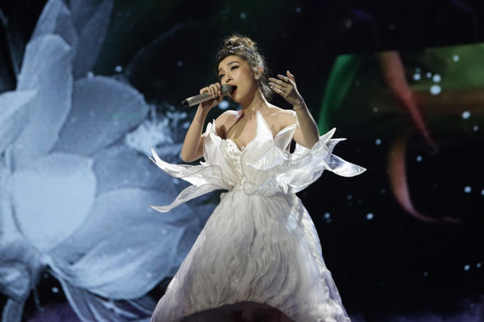 Tiêu Châu Như Quỳnh kết màn với bộ đôi ca khúc "Thu sầu - Giọt lệ sầu" của nhạc sĩ Lam Phương. Cô nàng đặc biệt thu hút khi mang đến bộ trang phục vô cùng bắt mắt với hình ảnh hoa quỳnh.