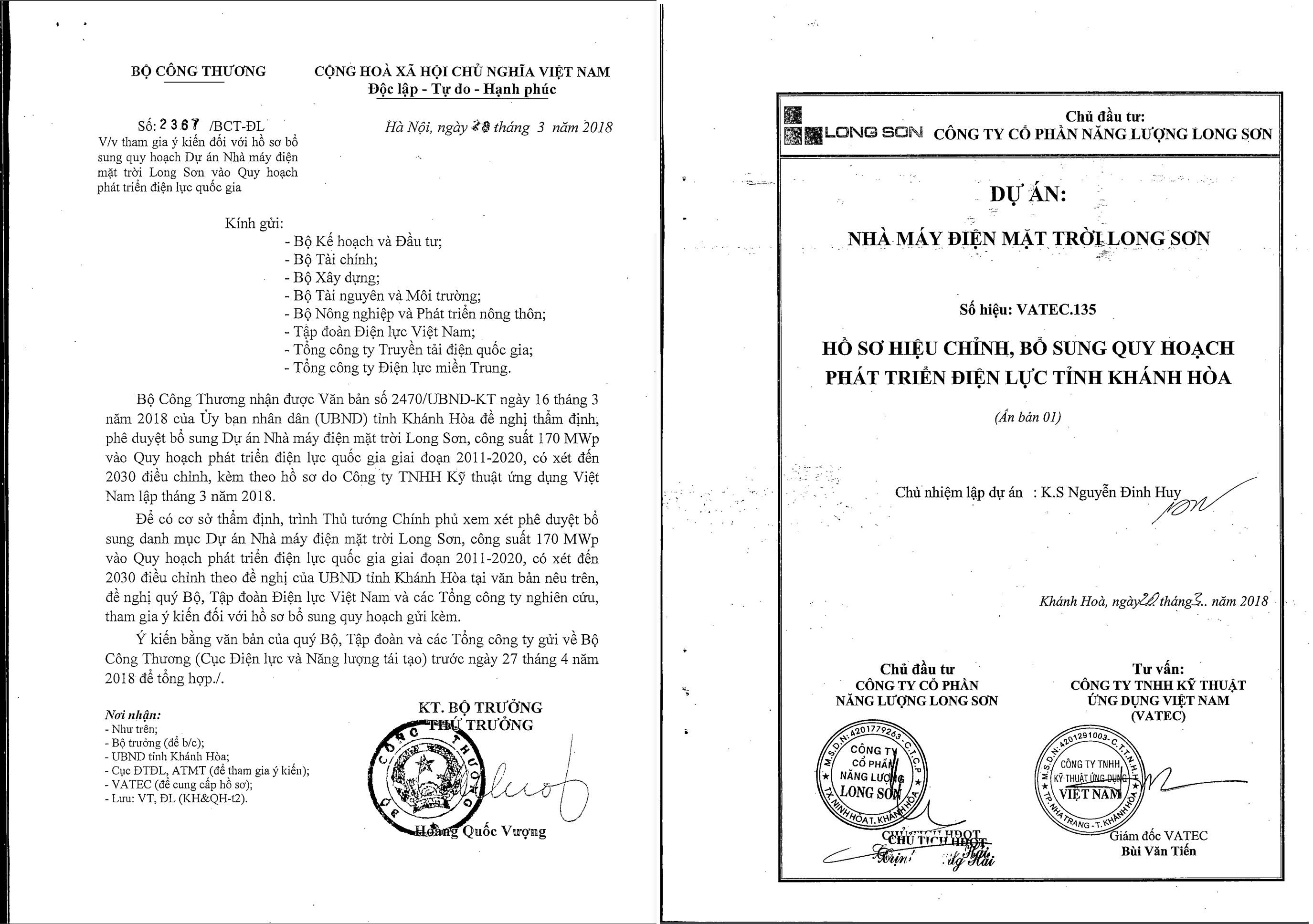 Liên quan đến dự án, sau khi Bộ Công thương có Công văn số 5778/BCT-ĐL ngày 23/7/2018, đến ngày 7/8/2018, Phó Thủ tướng Chính phủ Trịnh Đình Dũng đã ký quyết định số 1007/TTg-CN phê duyệt bổ sung nhà máy ĐMT Long Sơn vào Quy hoạch Điện VII điều chỉnh theo đề nghị của Bộ Công Thương.