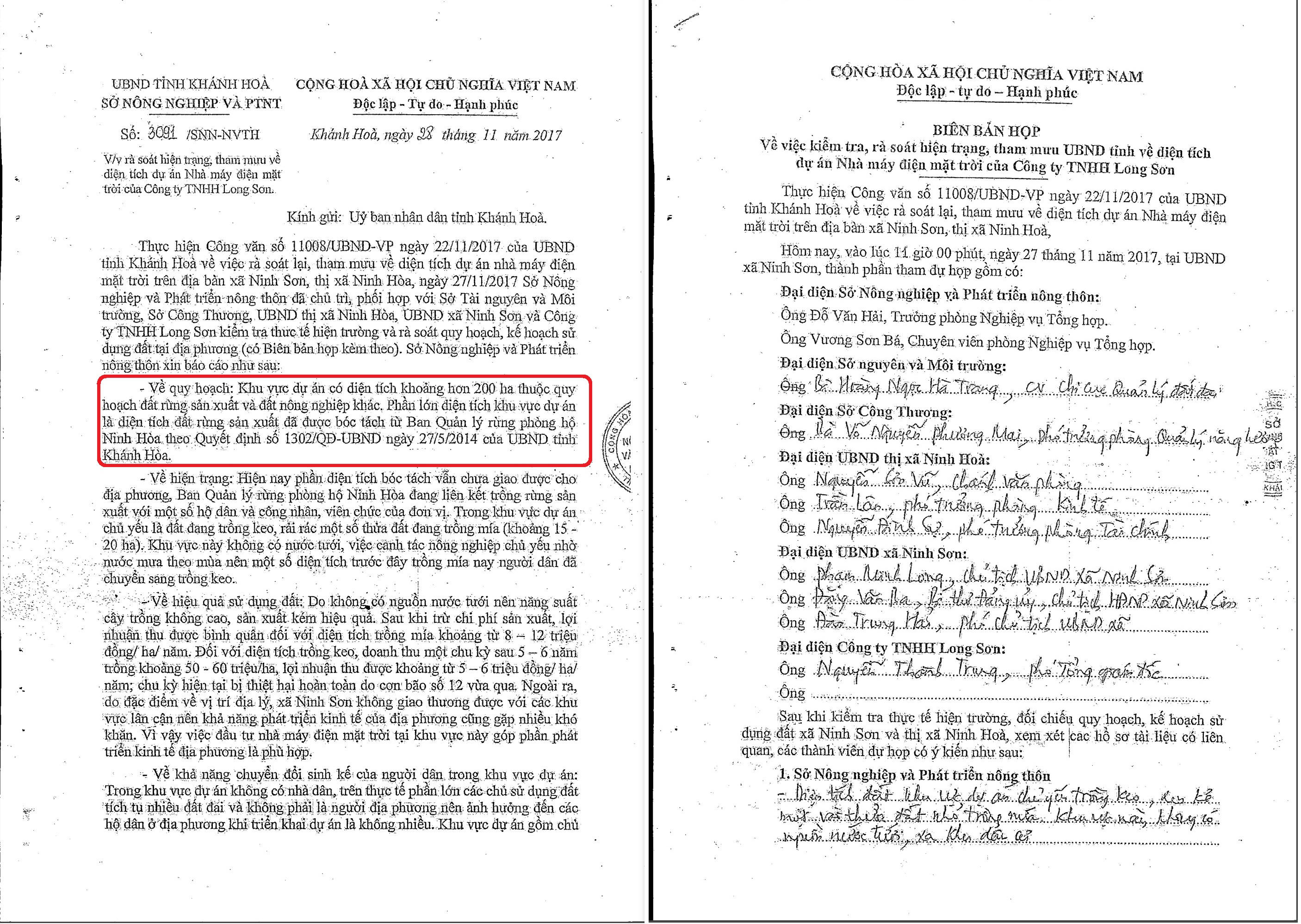 Đối với dự án, Sở NN&PTNT tỉnh Khánh Hòa đã có văn bản số 3091/SNN-NVTH về việc rà soát hiện trạng tham mưu về diện tích dự án Nhà máy điện mặt trời của Công ty TNHH Long Sơn. Trong đó nêu rõ: “Về quy hoạch: Khu vực dự án có diện tích khoản hơn 200ha thuộc quy hoạch đất rừng sản xuất và đất nông nghiệp khác, phần lớn diện tích khu vưc dự án là diện tích đất rừng sản xuất được bóc tách từ BQL rừng phòng hộ Ninh Hòa theo QĐ số 1302/QĐ-UBND ngày 27/5/2014 của UBND tỉnh Khánh Hòa.”