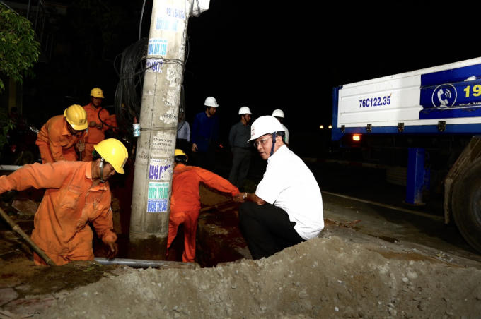 Tổng Giám đốc EVNCPC Ngô Tấn Cư (áo trắng) chỉ đạo khắc phục hậu quả bão số 9 năm 2020 tại Quảng Ngãi.