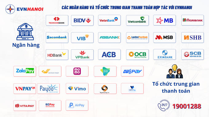 Tính đến thời điểm hiện tại, EVNHANOI đã hợp tác với 18 ngân hàng và 13 tổ chức trung gian thanh toán. Khách hàng khi thanh toán tiền điện trực tuyến có thể sử dụng một trong các hình thức sau: thanh toán trực tuyến trên Cổng dịch vụ công trực tuyến: dichvucong.gov.vn; Cổng giao tiếp điện tử Thành phố: hanoi.gov.vn; Mobile/SMS banking, Internet banking; thanh toán trích nợ tự động tài khoản.