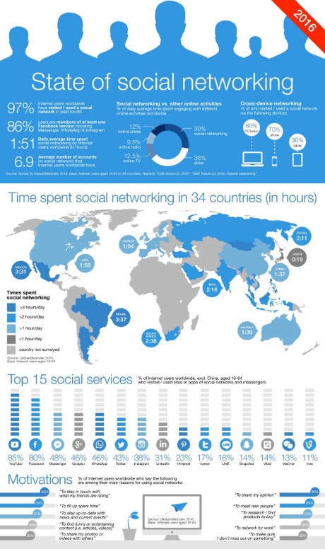Mạng xã hội đã thống trị lượng thời gian trực tuyến: trung bình người dùng tương tác với Facebook và các nền tảng khác trong 1 tiếng 51 phút mỗi ngày. Người dùng ở một số quốc gia khác còn dành nhiều thời gian cho mạng xã hội hơn nữa. Ví dụ, ở Brazil, thời gian dành cho mạng xã hội mỗi ngày là 3 tiếng 37 phút, nhiều hơn thời gian xem ti vi là 1 tiếng.