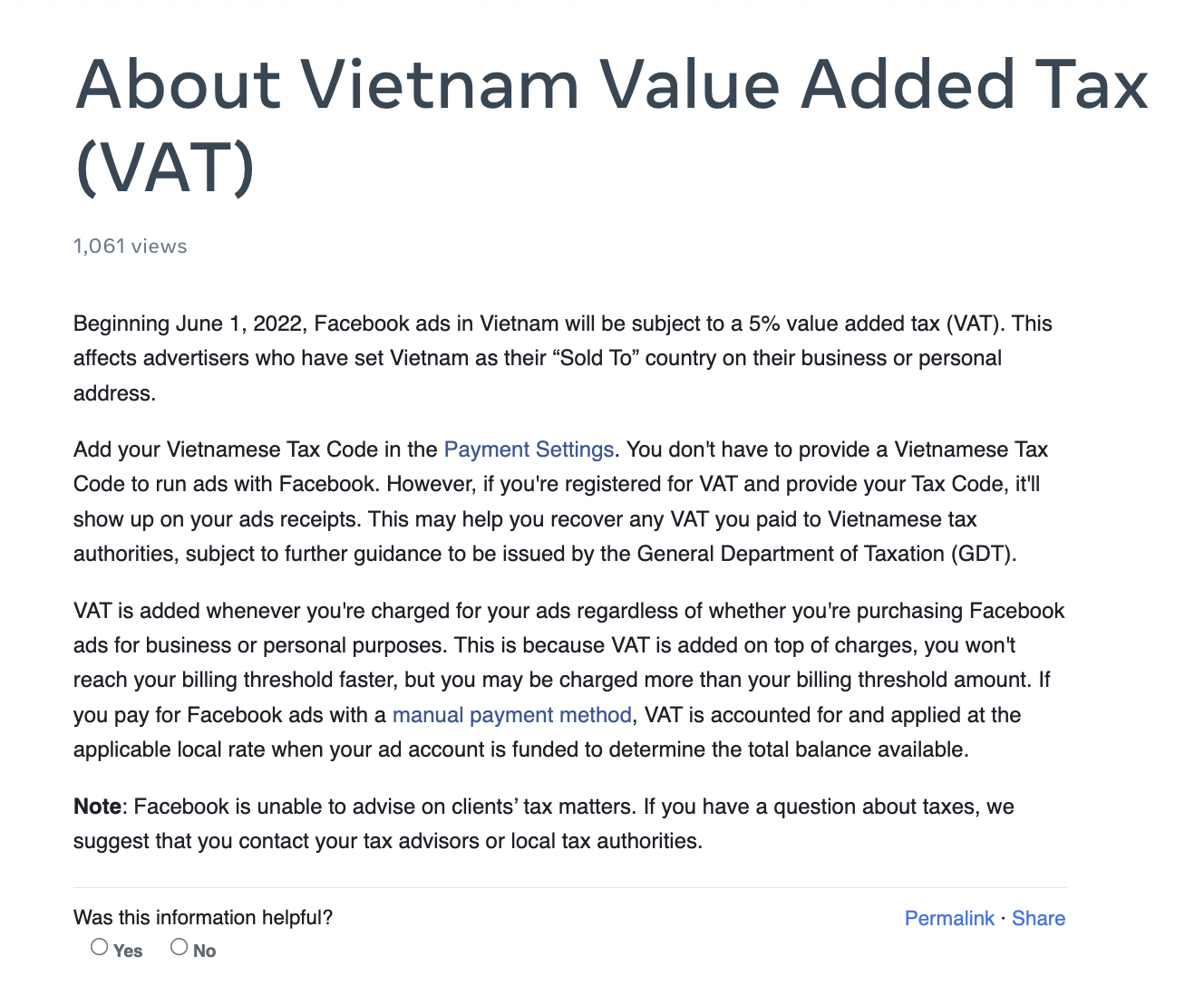 Trang hỗ trợ doanh nghiệp của Meta - công ty mẹ Facebook - mới đây thông báo, từ ngày 1/6, các quảng cáo trên nền tảng Facebook tại Việt Nam sẽ chịu thêm 5% thuế giá trị gia tăng (VAT). Việc thêm mã số thuế Việt Nam sẽ nằm trong phần cài đặt thanh toán, dù Facebook không yêu cầu phải cung cấp mã số thuế khi chạy quảng cáo.