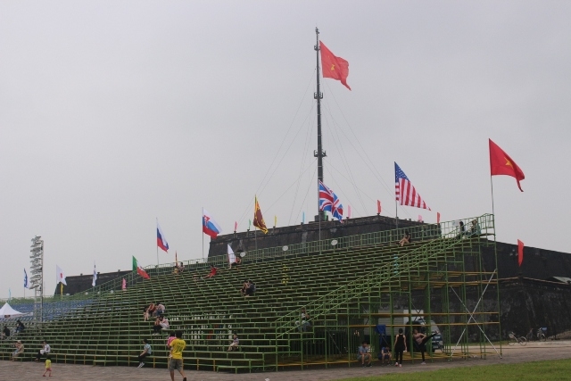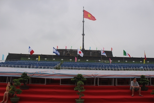 | Sân khấu ở kỳ đài được trang trí, xây dựng tươm tất cho buổi khai mạc đêm nay 29/4. |