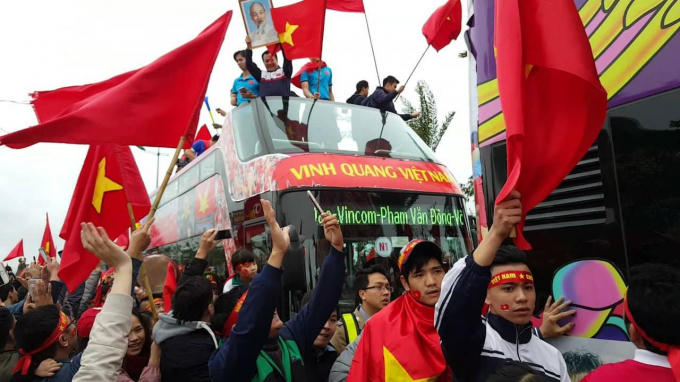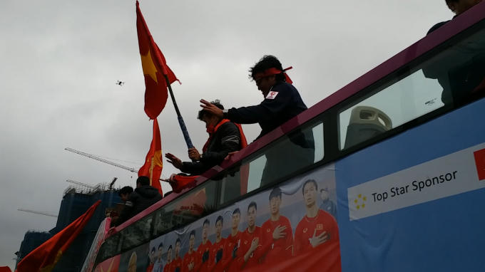Xe buýt 2 tầng chở đội tuyển U23 được chào đón giữa rừng cờ đỏ suốt 30km từ sân bay Nội Bài về trung tâm Thủ đố Hà Nội.