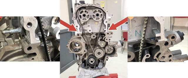 Trong khi đó, đối với vị trí thấm dầu tại nắp che dây đai cam là do độ làm kín khu vực mặt lắp ghép (chữ T), gây ngấm dầu từ trong khoang chứa cơ cấu dẫn động cam ra bên ngoài.