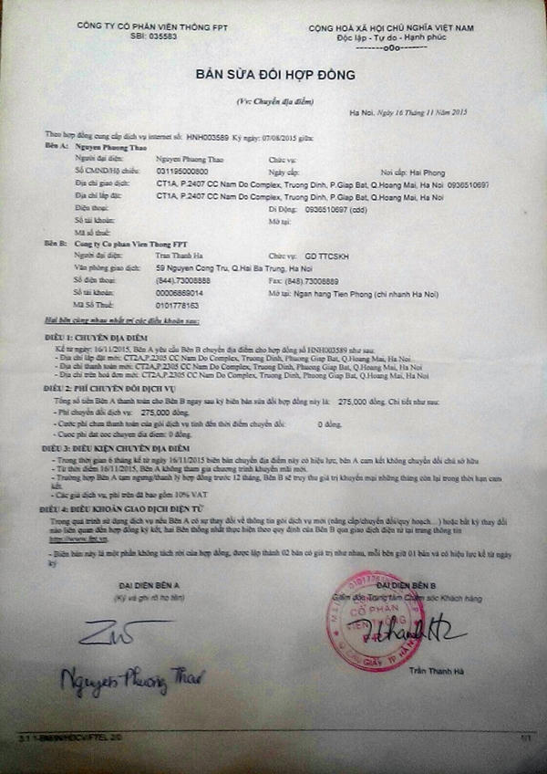 Ngày 16/11/2015, chị Nguyễn Phương T (Bên A) ký Bản sửa đổi hợp đồng về việc chuyển địa điểm với bà Trần Thanh Hà, chức vụ Giám đốc Trung tâm chăm sóc khách hàng của Công ty Cổ phần Viễn thông FPT, có trụ sở tại 59 Nguyễn Công Trứ, quận Hai Bà Trưng, Hà Nội.