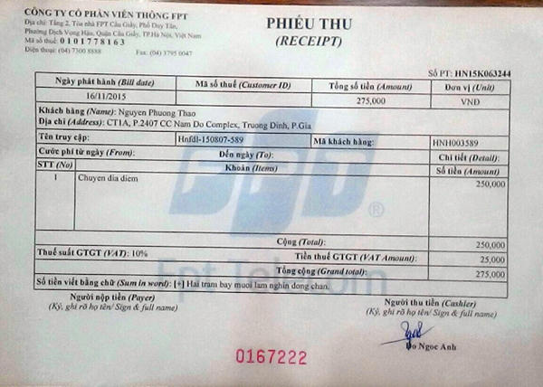 Bức xúc vì bị mất tiền oan, khách hàng tiếp tục liên hệ tới tổng đài hỗ trợ khách hàng của FPT Telecom theo số điện thoại: 0473008888. Nhân viên hỗ trợ thông tin dịch vụ (xưng tên là Chung, có mã số 371) cho biết, bên FPT Telecom ghi nhận là “không thể chuyển địa điểm cho khách hàng”.