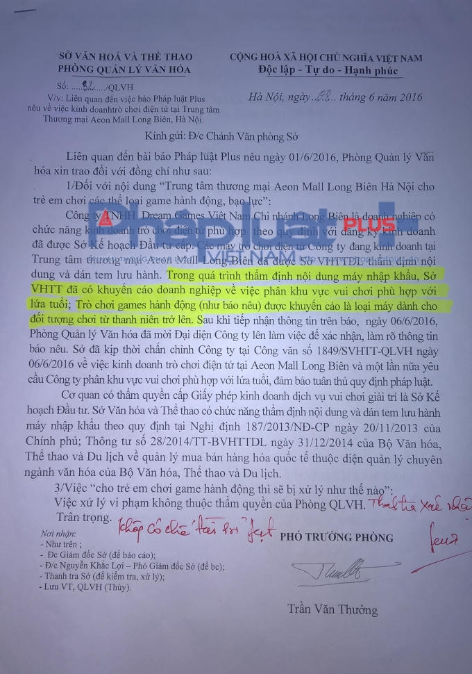 Trước đó, ngày 06/06/2016, Phòng Quản lý Văn hóa đã mời Đại diện Công ty lên làm việc để xác nhận, làm rõ thông tin. Sở đã kịp thời chấn chỉnh Công ty tại Công văn số 1849/SVHTT-QLVH ngày 06/06/2016 về việc kinh doanh trò chơi điện tử tại Aeon Mall Long Biên và một lần nữa yêu cầu Công ty phân khu vực vui chơi phù hợp lứa tuổi, đảm bảo tuân thủ đúng quy định pháp luật.