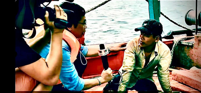 Nhà báo Trọng Ninh phỏng vấn ngư dân trong khi tác nghiệp tại Bình Thuận.