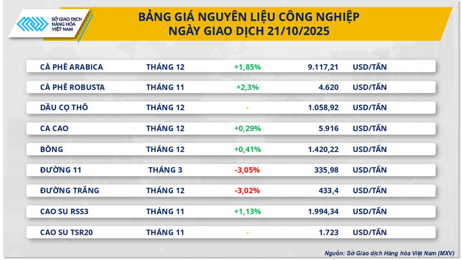 Trái ngược với diễn biến ảm đạm của nhóm kim loại quý, giá cà-phê thế giới tiếp tục khởi sắc khi nguồn cung từ Brazil - quốc gia sản xuất và xuất khẩu lớn nhất toàn cầu sụt giảm mạnh. Kết phiên 21/10, hợp đồng Arabica giao tháng 12 tăng 1,85% lên 9.117 USD/tấn, còn Robusta kỳ hạn tháng 11 tăng 2,3% lên 4.620 USD/tấn.