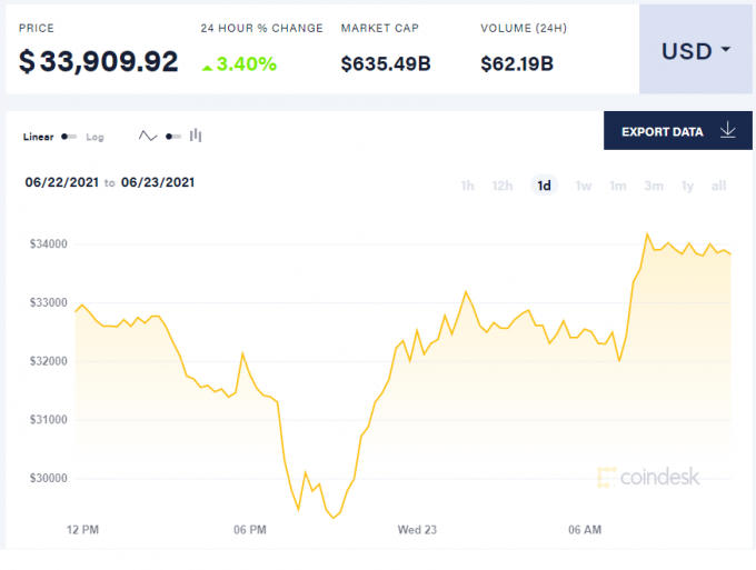 Lúc 11h00 ngày 23/6 (theo giờ Việt Nam), giá Bitcoin trên CoinDesk đứng ở 33.909 USD, tăng 3,4% giá trị trong 24 giờ qua.