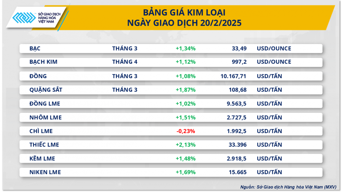 Trên thị trường kim loại cơ bản, giá đồng COMEX tăng hơn 1% lên mức 10.167 USD/tấn, tăng gần 16% so với hồi đầu năm. Giá quặng sắt cũng tăng tới 1,87%, đạt 108,68 USD/tấn, đánh dấu mức cao nhất kể từ đầu tháng 10/2024.