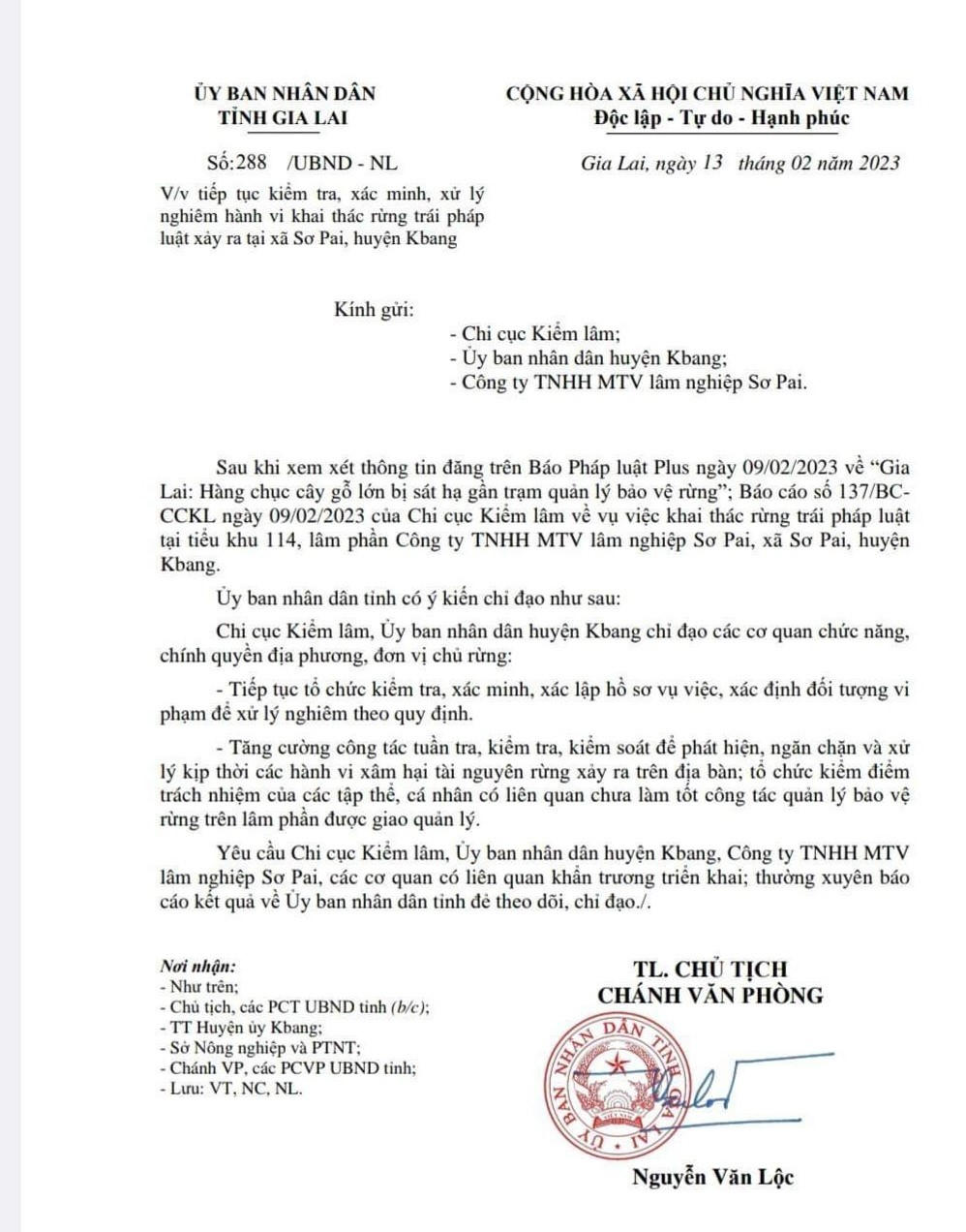 Đến ngày 13/2, UBND tỉnh Gia Lai đã có văn bản số 288/ UBND-NL chỉ đạo UBND huyện Kbang, Chi cục kiểm lâm tỉnh và Hạt kiểm lâm huyện Kbang và các đơn vị liên quan gấp rút vào cuộc xác minh, tiếp tục điều tra, xác lập hồ sơ vụ việc, xác minh đối tượng vi phạm để xử lý theo quy định pháp luật. Tăng cường công tác tuần tra, kiểm tra, kiểm tra và xử lý kịp thời các hành vi xâm hại tài nguyên trên địa bàn, tổ chức kiểm điểm trách nhiệm của các tập thể, cá nhân có liên quan trong việc quản lý bảo vệ rừng trên lâm phần được giao quản lý.