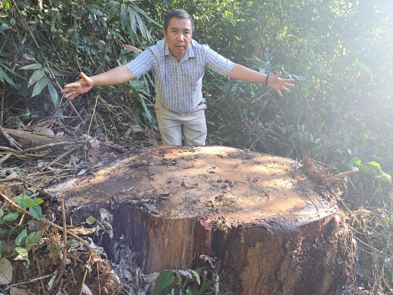 Theo báo cáo của Hạt kiểm lâm huyện Kbang, “cây gỗ số 1 chủng loại Chò Chỉ, có đường kính mặt cắt gốc 75cm, đường kính trung bình 65cm, thân cây dài 20,4 cm đã bị cắt thành 5 lóng. Toàn bộ gỗ vẫn còn nguyên tại hiện trường. Cây gỗ số 2 chủng loại Xoay, đường kính mặt cắt gốc 45cm, đường kính trung bình 43cm. Tại hiện trường chỉ còn lại cành, ngọn phần gốc cây đã bị đốt cháy hoàn toàn.