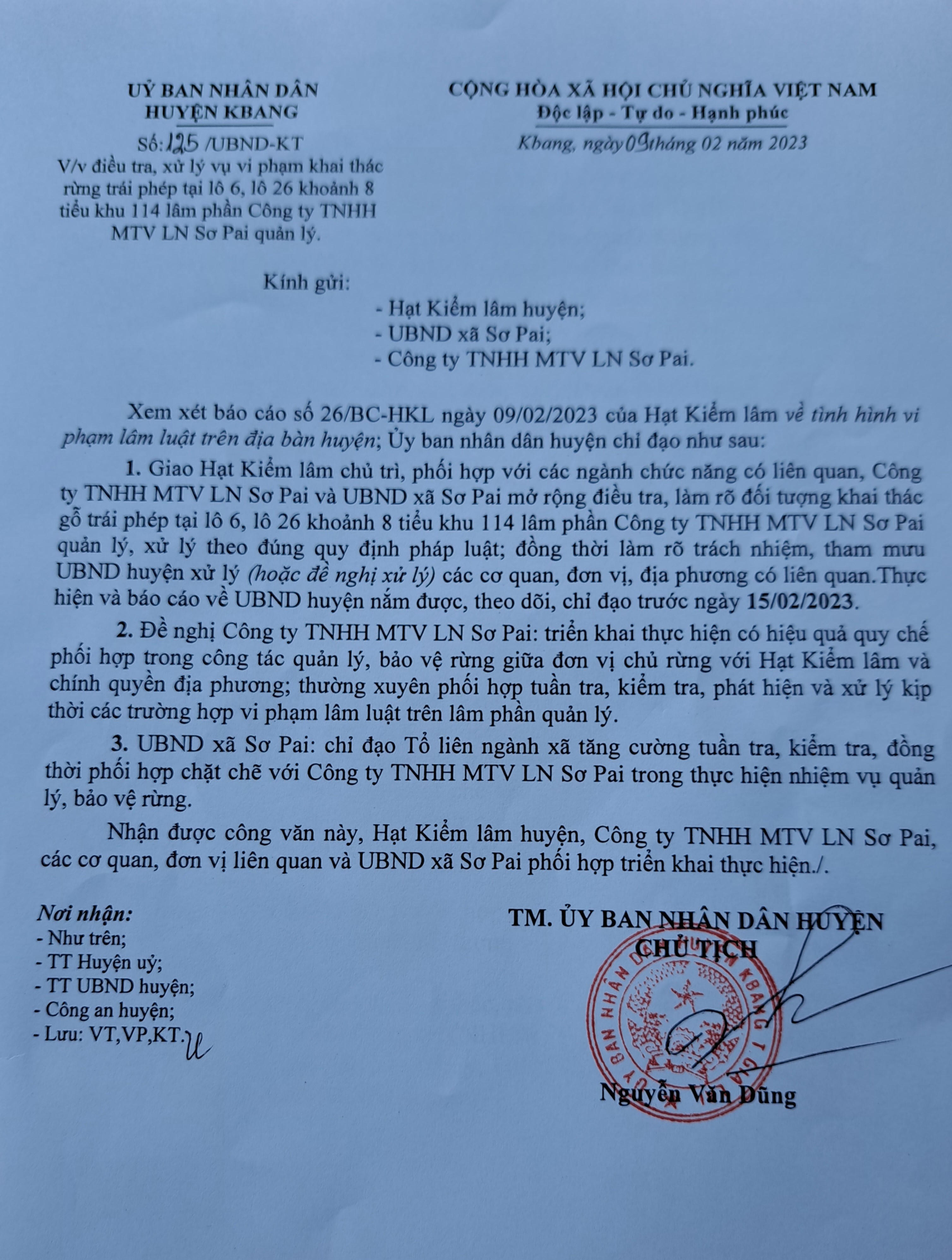 Trước đó, ngày 9/2, sau khi nhận được chỉ đạo của UBND huyện Kbang, Hạt Kiểm lâm huyện Kbang đã phối hợp với Công an huyện, Đội Kiểm lâm CĐ&PCCCR số 1, Công ty TNHH MTV lâm nghiệp Sơ Pai tiến hành kiểm tra tại lô 6, lô 26 khoảnh 8 tiểu khu 114 lâm phần quản lý của Công ty TNHH MTV lâm nghiệp Sơ Pai phát hiện có 2 cây gỗ bị cắt hạ, khai thác trái pháp luật.