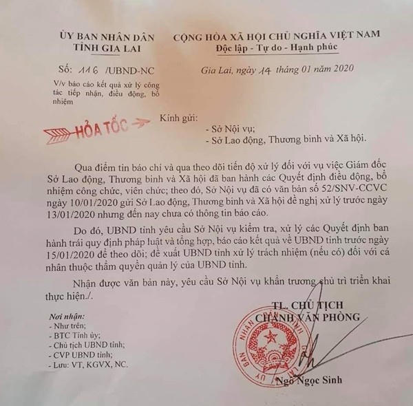 Công văn hoả tốc của UBND tỉnh Gia Lai dẫn báo cáo số 52 của Sở Nội vụ về việc Giám đốc Sở Lao động, Thương binh và Xã hội đã ban hành các Quyết định điều động, bổ nhiệm công chức, viên chức trái luật. Văn bản của Sở Nội vụ đề nghị Sở Lao động, Thương binh và Xã hội báo cáo việc xử lý, khắc phục trước ngày 13/01/2020 nhưng đến nay chưa có thông tin báo cáo.